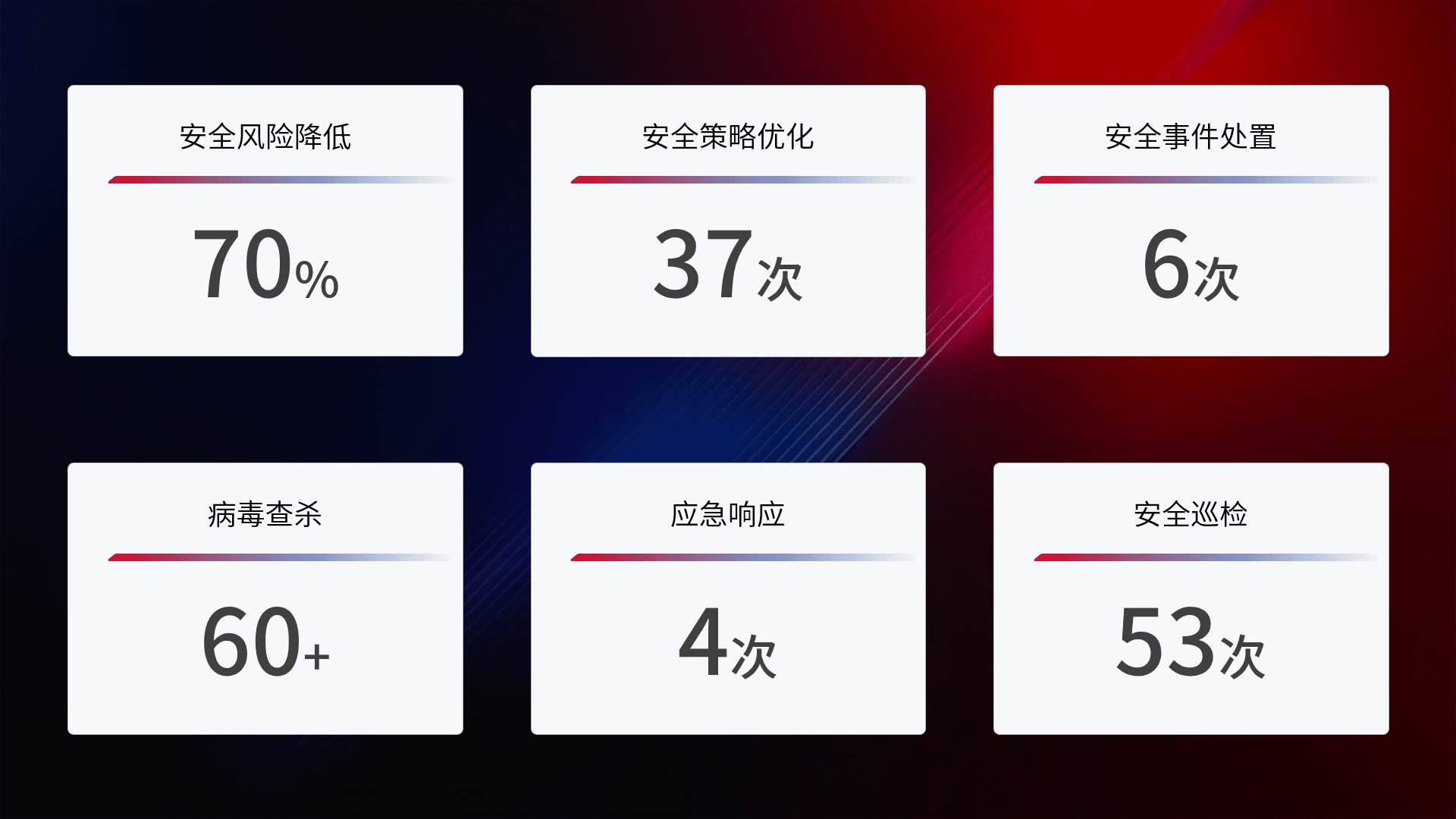 提供全面的安全事件报告体系,,,,包括处置报告、、、、周报、、季度和年度总结,,,,结合持续监控,,帮助客户深入了解网络安全状况。。