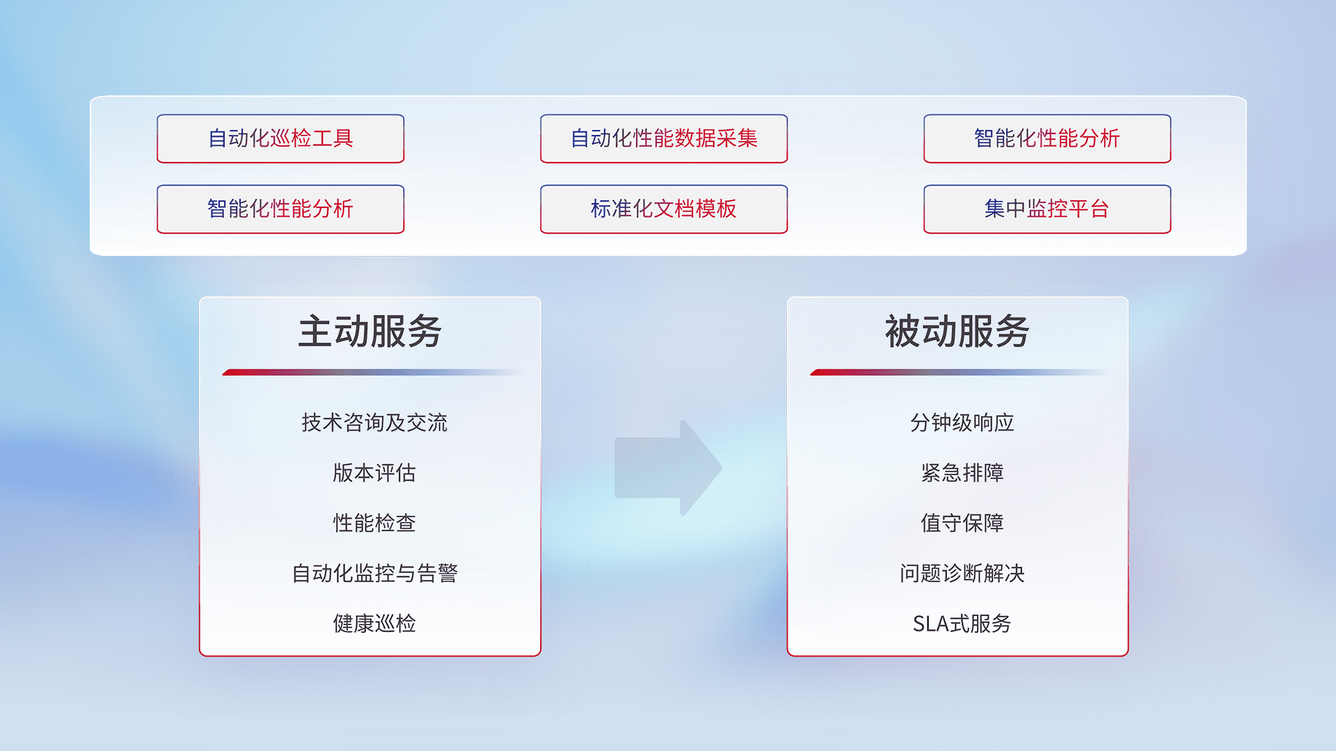 智能化工具和标准化文档,,,保障服务质量,,,,提供主动服务(包含技术咨询、、、、版本评估、、性能检查、、自动化监控与告警、、健康巡检)和被动服务包含(分钟级响应、、、紧急排障、、、、值守保障、、问题诊断解决、、SLA服务)。。
